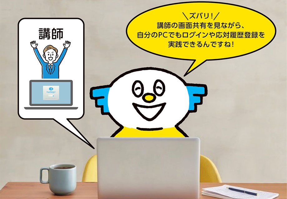 (笑)。操作トレーニングは、現在3密を避けるために、基本的にオンラインで開催しています。当社のFastSeriesには、コンタクトセンターCRMシステム「FastHelp」やFAQナレッジシステム「FastAnswer」などがありますが、今日FastちゃんにはFastHelpの「担当者編」を受けてもらいますね。