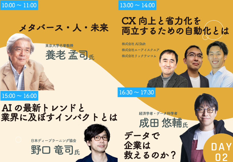 DAY2の特別なセッションはこの4つ!「メタバース」「自動化」「AI」「データ×企業」と気になるキーワードが満載です!セッションの詳しい概要文はセッション一覧 でご確認いただけますので、是非事前にチェックしてみてください。