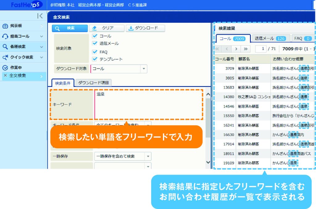 問い合わせ時は素早い対応が求められるので非常に便利です。また、このフラグごとにデータを抽出してCSVで出力するなど、レポート作成などへの活用も容易です。さらに嬉しいのが全文検索機能で、必要なキーワードを入れるだけで、すぐに目的の情報にたどり着くことができます(図3)」と評価する。