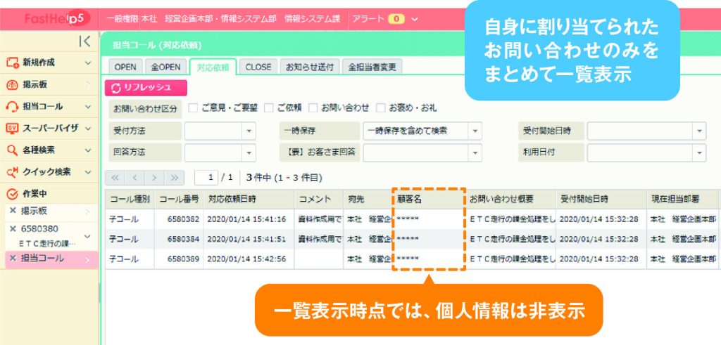 特に個人情報の管理は安全にかかわる重要な部分であるため、実際にはFastHelp内に登録された個人情報は対応者のみが閲覧でき、対応完了後は一定期間後に個人情報のみを消去する運用を採用している。