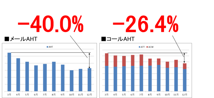 ケンコーコムでは、コールセンター業務の効率化を図るために、2016年7月にFastHelpを導入。導入後、メールのAHT (Average Handling Time/平均応対時間)では40%の削減、一方、コールのAHTでも26.4%の削減という成果を上げている。(図3)