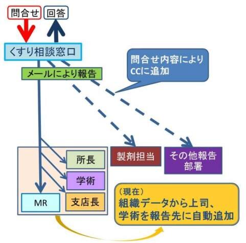 さらにシステムのバージョンアップ時には、情報共有環境を改善するため、システムに社員のマスターデータを登録。医療機関からの問合せ内容をMRに社内メールで報告する際、その上司や関連する学術担当者のメールアドレスが自動で追加されることで、送信の手間を軽減し、ミスなく確実に情報が伝わる仕組みを構築した。